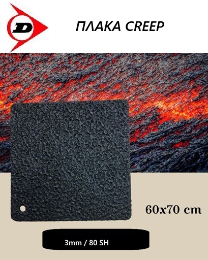 Πλάκα λάστιχο CREEP 3mm της DUNLOP για σόλες, διαστάσεις 60×70 εκ., σκληρότητα 80 shore. Αντιολισθητική και αθόρυβη, από εξαιρετικής ποιότητας πρώτες ύλες, εξασφαλίζει μοναδική αντοχή. Διατίθεται σε πάχος 3 χιλ.